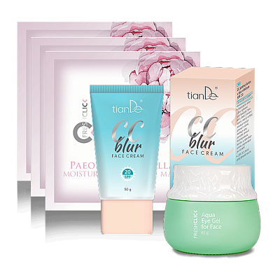 S TianDe nie sú pre dokonalú pleť potrebné filtre – stačia len tri prípravky. CC pleťový krém s blur efektom a SPF 20 v sebe spája kvalitnú starostlivosť, spoľahlivú ochranu pred slnečnými lúčmi a zjednotenie odtieňa pleti. Kúra hydratačných PGA-masiek na tvár pomôže pleť obnoviť, dodá jej mladistvý, svieži a upravený vzhľad. Výsledok podporí Aquagel na oči a tvár, ktorý získate ako bonus.